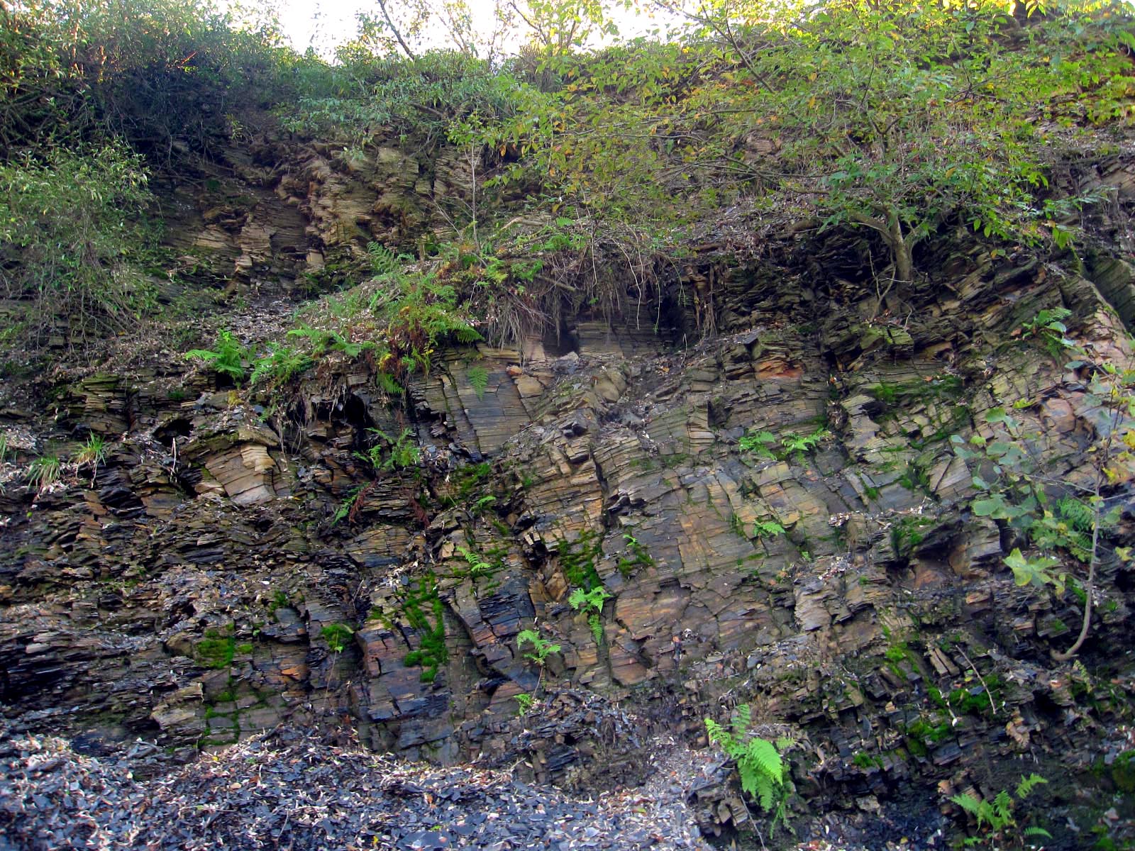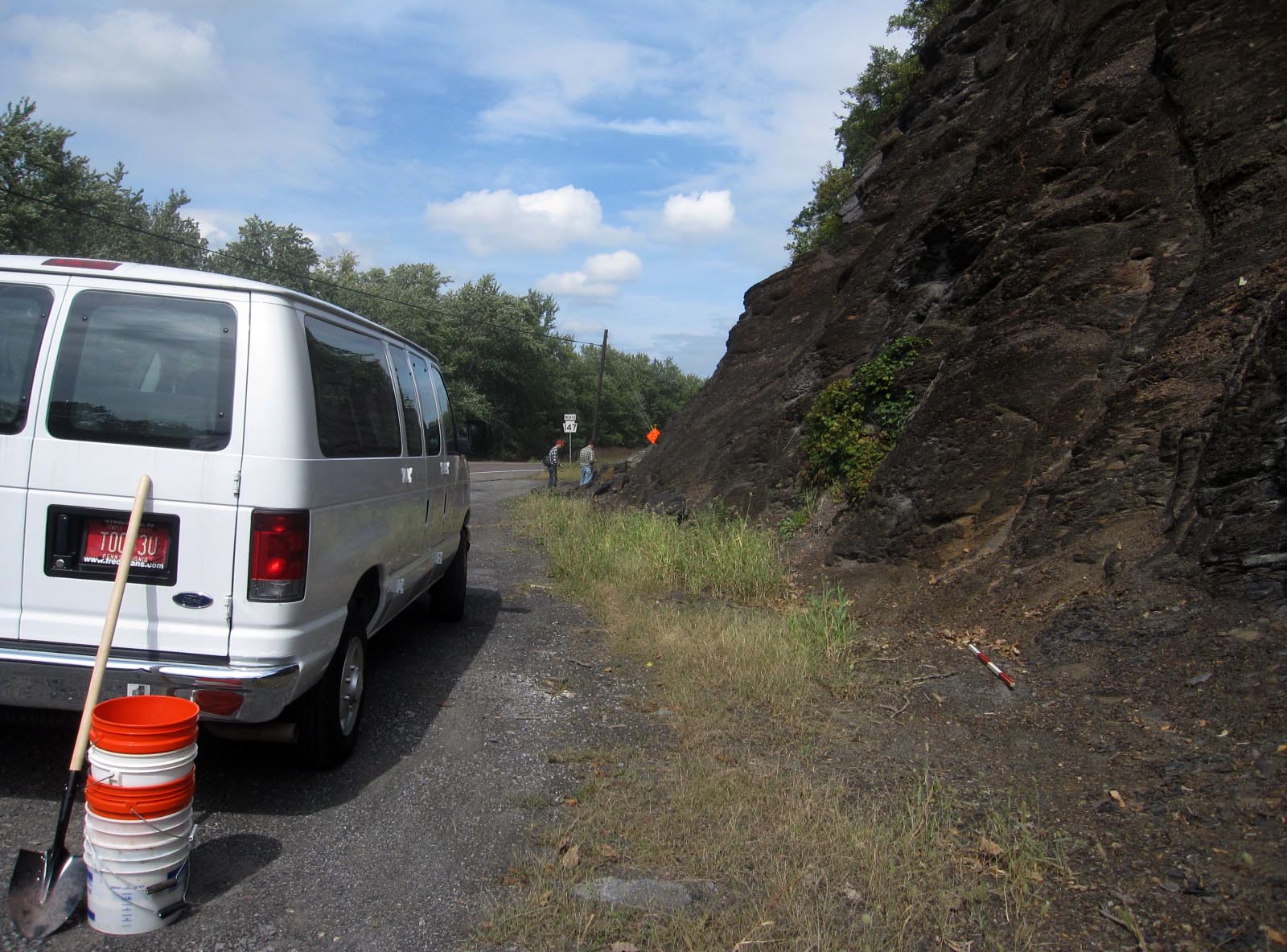 Two geologists from Temple who helped analyze the rock and clay I've been working with joined me on the return visit to the outcropping. They were doing some work on the Marcellus, but had yet to visit a site, so we teamed up, borrowed a van, and hit the road. It was about a 3 hour drive each way. We'd previously met just briefly. I didn't know what their interest was with the rock. Fracking is such a highly charged topic.